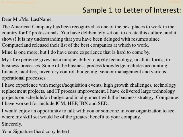 Applying to a Job at Starbucks Resume & Cover Letter Tips for Starbucks Starbucks Interview Questions Write an engaging Barista cover letter with Indeed's library of free cover letter samples and templates.