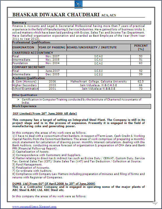 Resume Sample of an Experience Chartered Accountant with ...