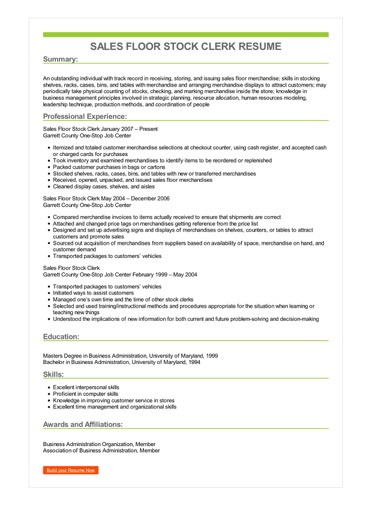 Sample Sales Floor Stock Clerk Resume
