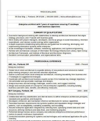 Resume Enterprise Architect. Guide the recruiter to the conclusion that you are the best candidate for the it enterprise architect job. More importantly, an EA has to know how the former serves the latter in the best way.